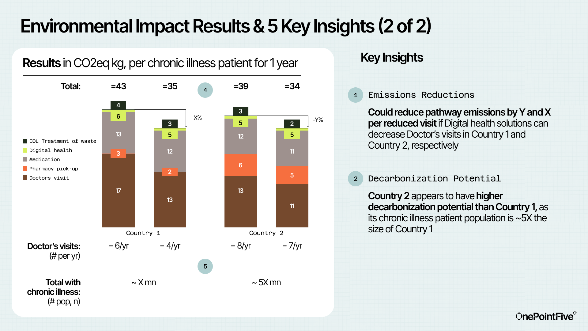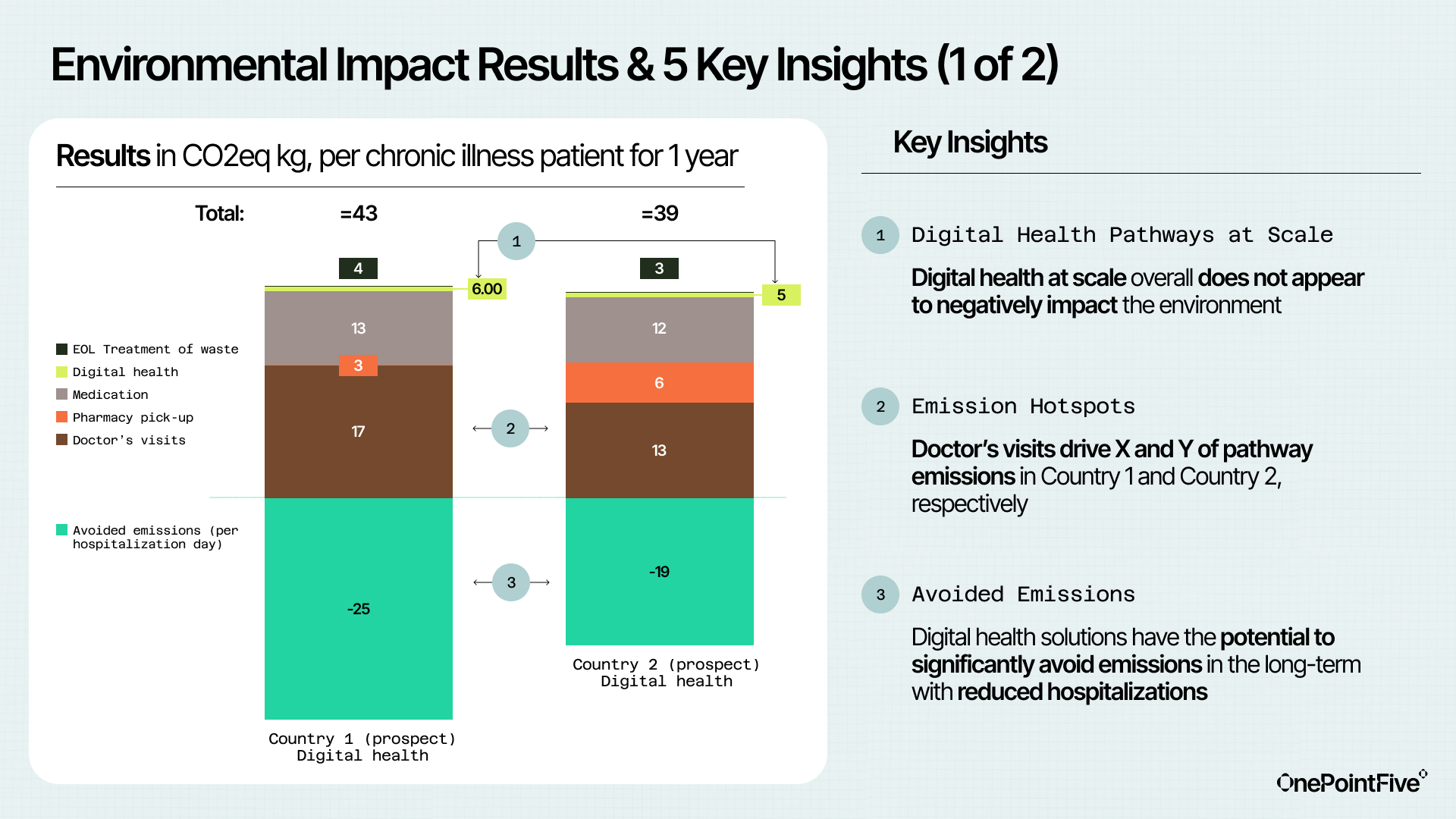 OnePointFive developed a Life Cycle Assessment (LCA) model to quantify the carbon emissions and trade-offs between digital versus traditional healthcare delivery for a chronic illness. We assessed 6 distinct care pathways in two countries, comparing the environmental impacts of digital vs. in-person care, with a focus on reducing emissions without compromising patient access or care quality.