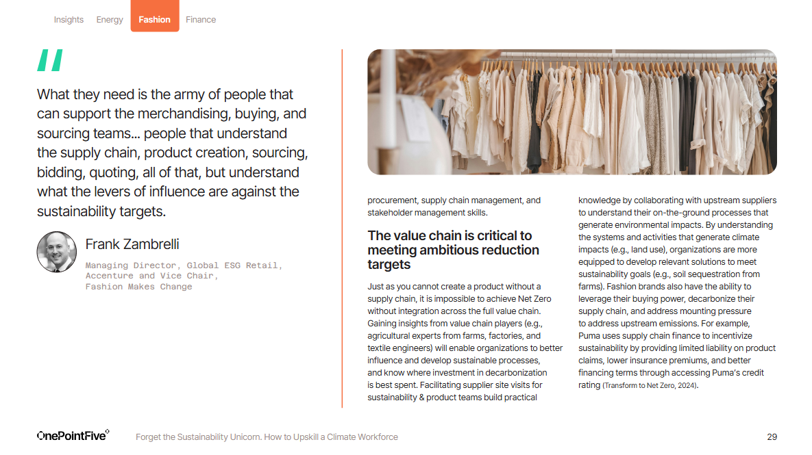 Financing the transition is only half the battle; you need a workforce that can actually execute. As Frank Zambrelli (Accenture) highlights in our playbook, “Forget the Sustainability Unicorn: How to Upskill a Climate Workforce”, fashion doesn’t need a single "Sustainability Unicorn": it needs an army of sourcing and merchandising professionals who understand how to pull climate levers.
