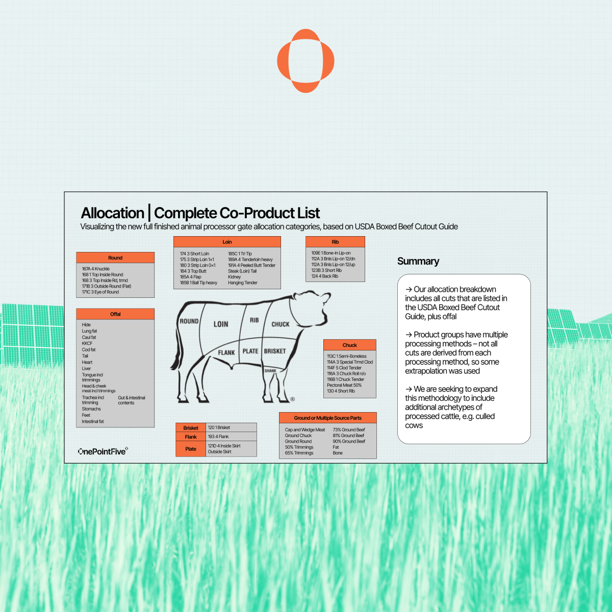 Drawing on leading methodologies (such as the EU Product Environmental Footprint (PEF), the IDF Global Carbon Footprint Standard for Dairy, and the FAO’s Large Ruminant Guidelines) we designed a new emissions allocation model tied to USDA price data for over 70 beef sub-products.