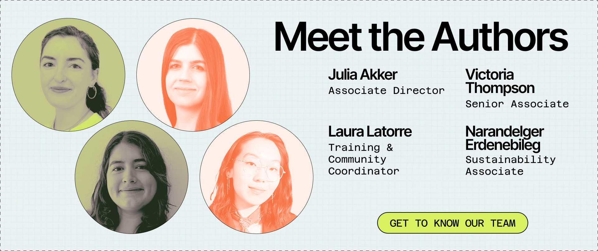 By Julia Akker (Associate Director), Victoria Thompson (Senior Associate), Laura Latorre (Sustainability Training & Community Coordinator) and Narandelger Erdenebileg (Sustainability Associate)