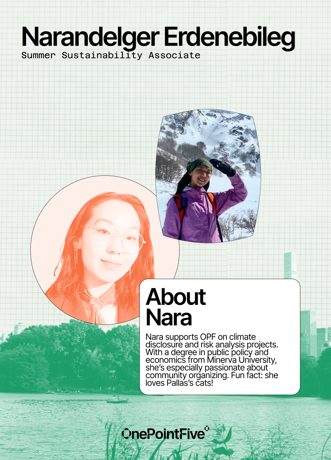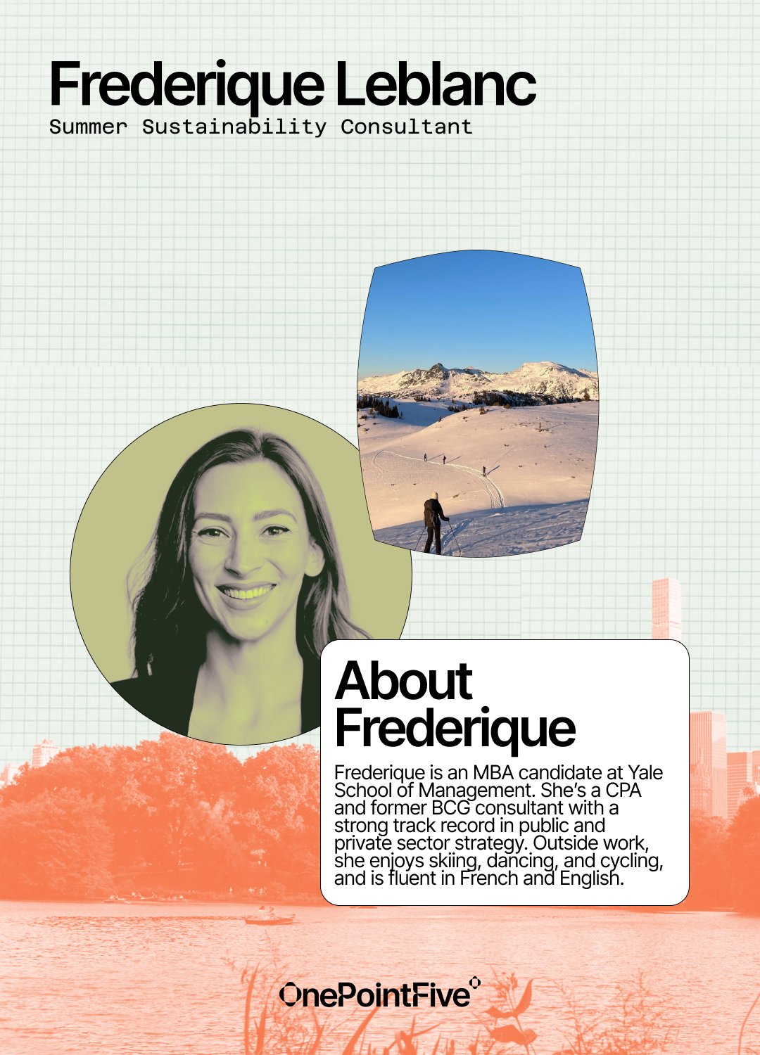 At OPF, she’s been able to combine her background in management consulting skills and her passion for climate sustainabilty: “My summer at OPF has allowed me to leverage my consulting toolkit while learning about specific sustainability topics, with an amazing value-driven team.”