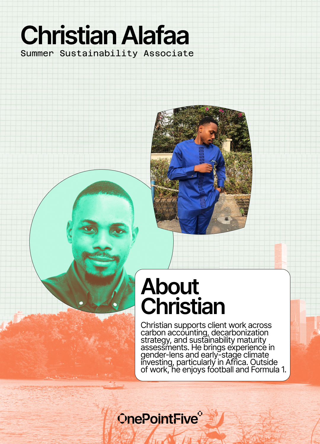 Breaking into corporate sustainability in Africa meant forging his own path: building skills independently, joining global climate communities, and navigating a still-emerging market. By 2024 Chris was ready for the first step and joined OPF Academy Cohort 4, which gave him the technical skills, confidence, and credibility to land his first corporate sustainability role: “OnePointFive Academy provided exactly that, a structured pathway to translate my passion and foundational knowledge into actionable corporate sustainability expertise.”